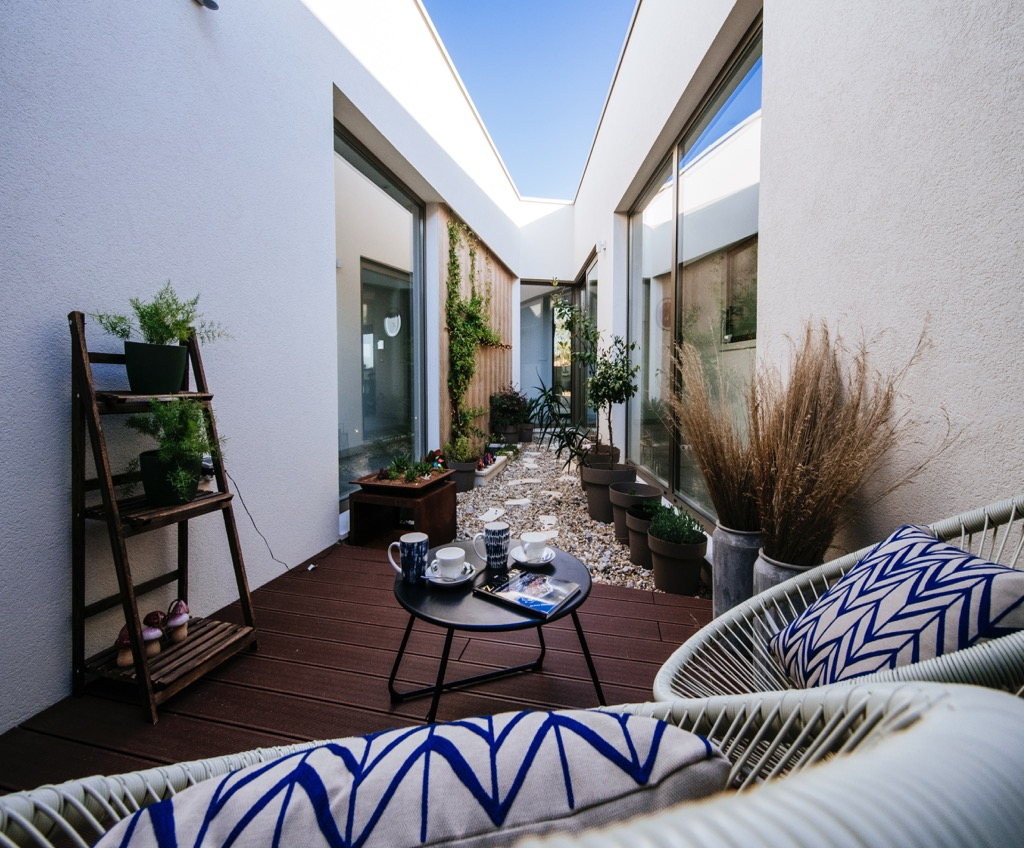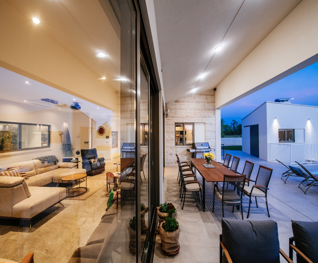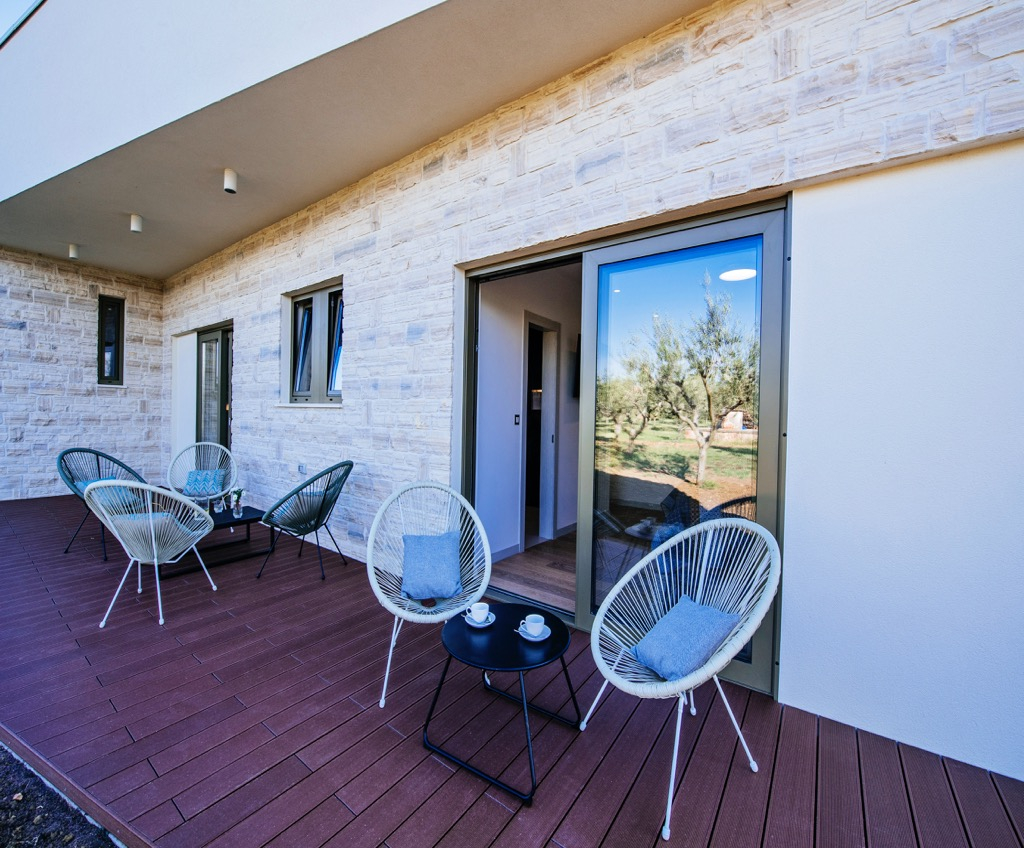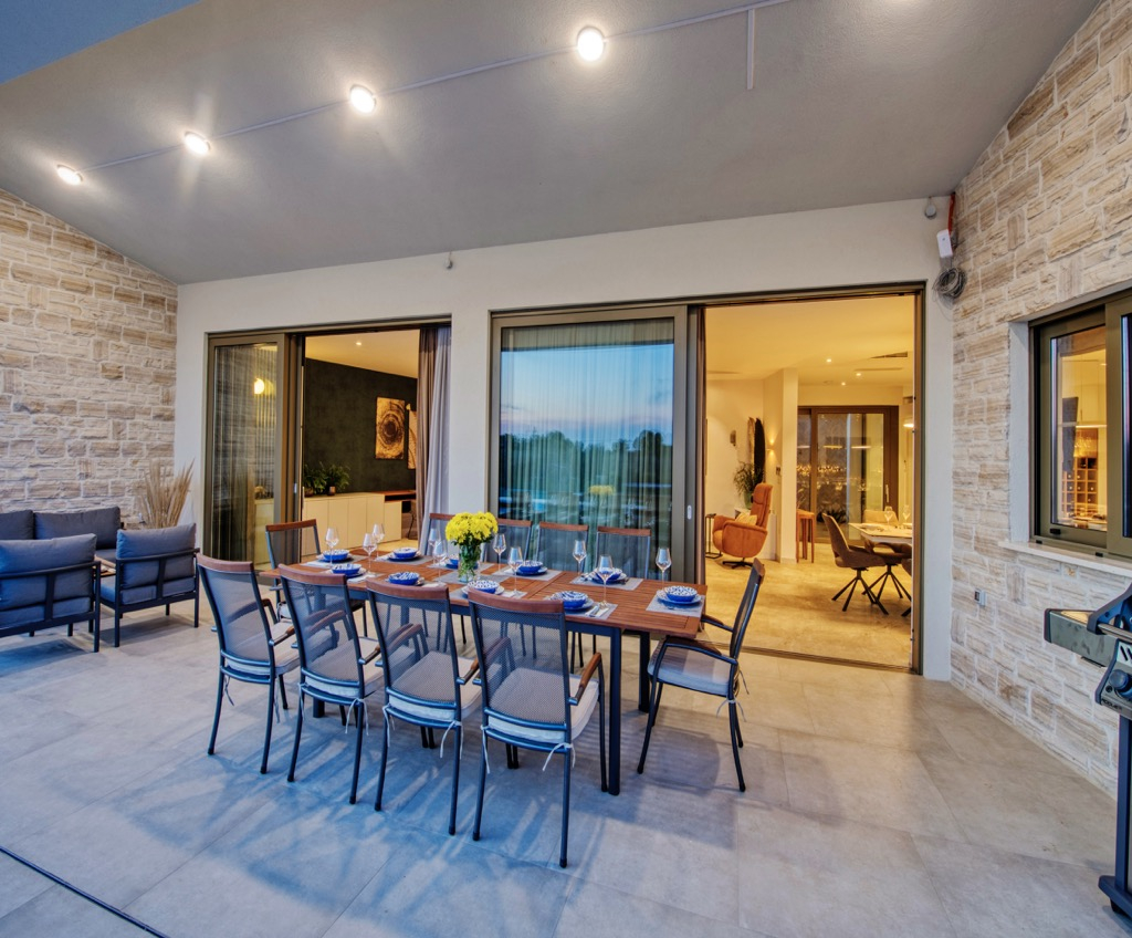 A tágas terasz, amely társalgóként szolgál, egy különálló vendégházzal van összekötve, és harmonikusan illeszkedik az összkoncepcióba.