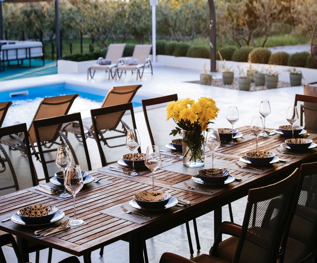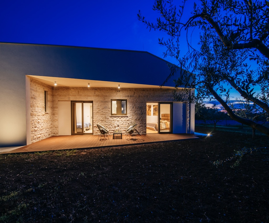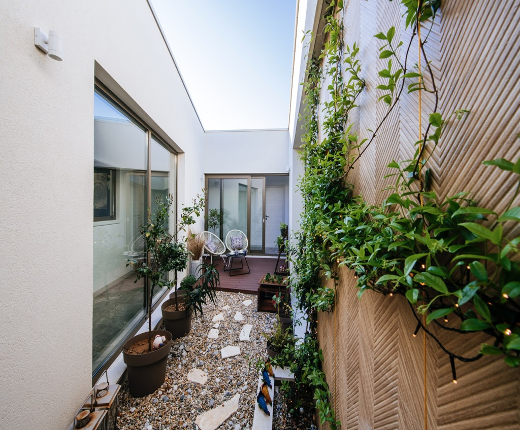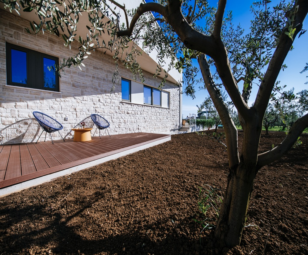 A tágas terasz, amely társalgóként szolgál, egy különálló vendégházzal van összekötve, és harmonikusan illeszkedik az összkoncepcióba.