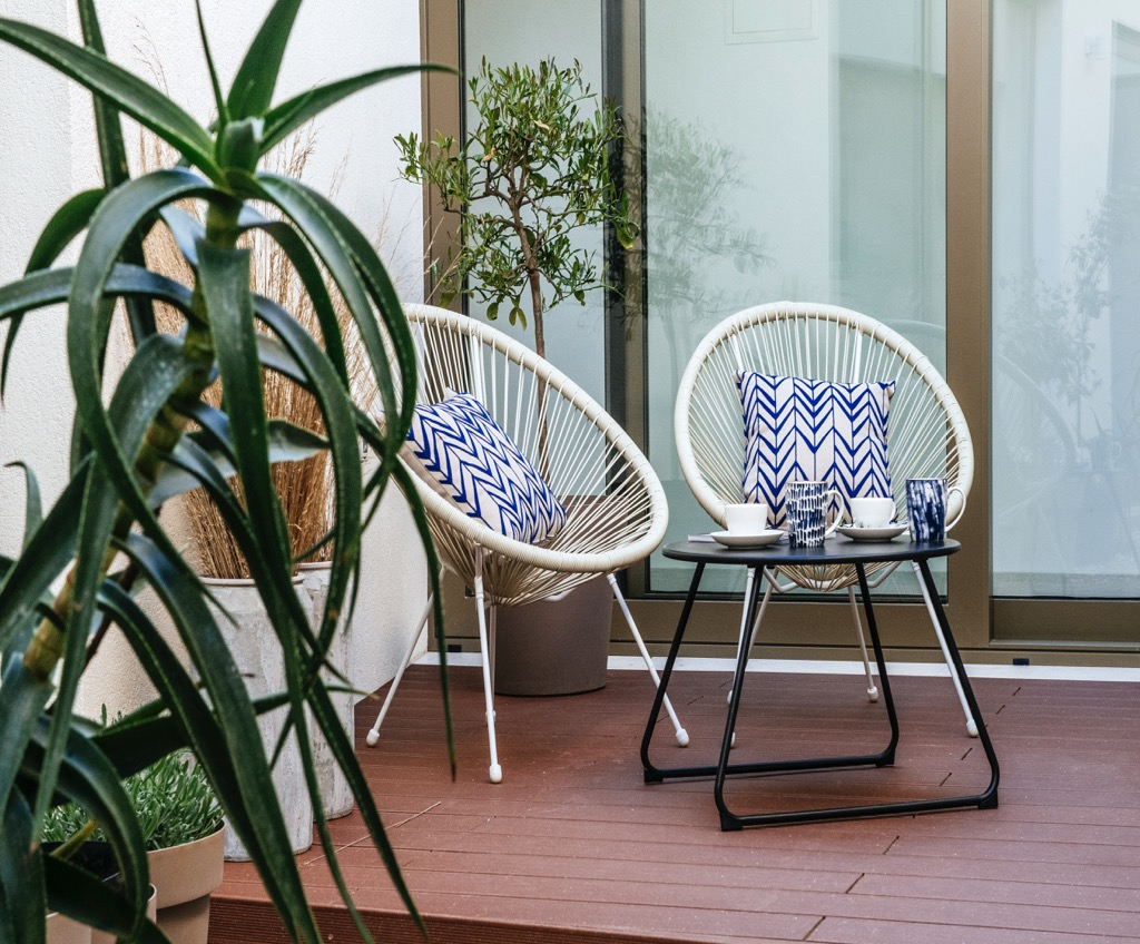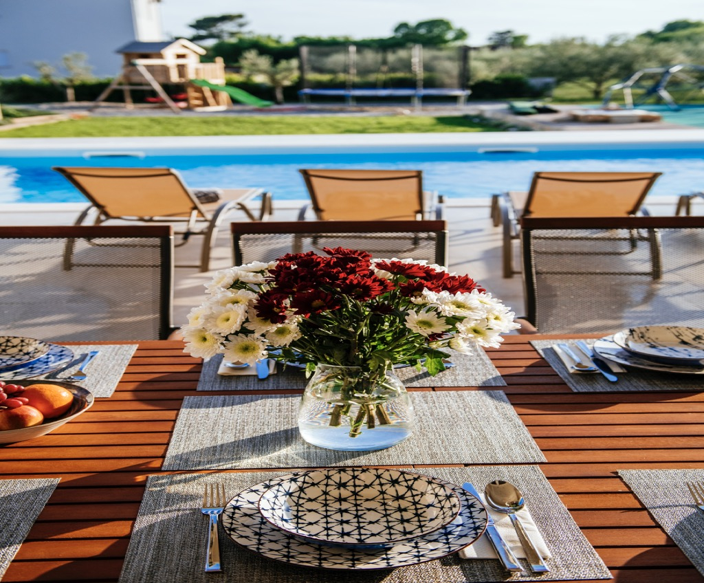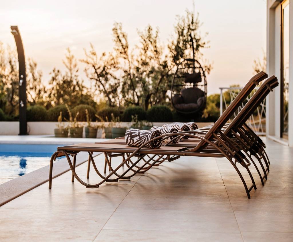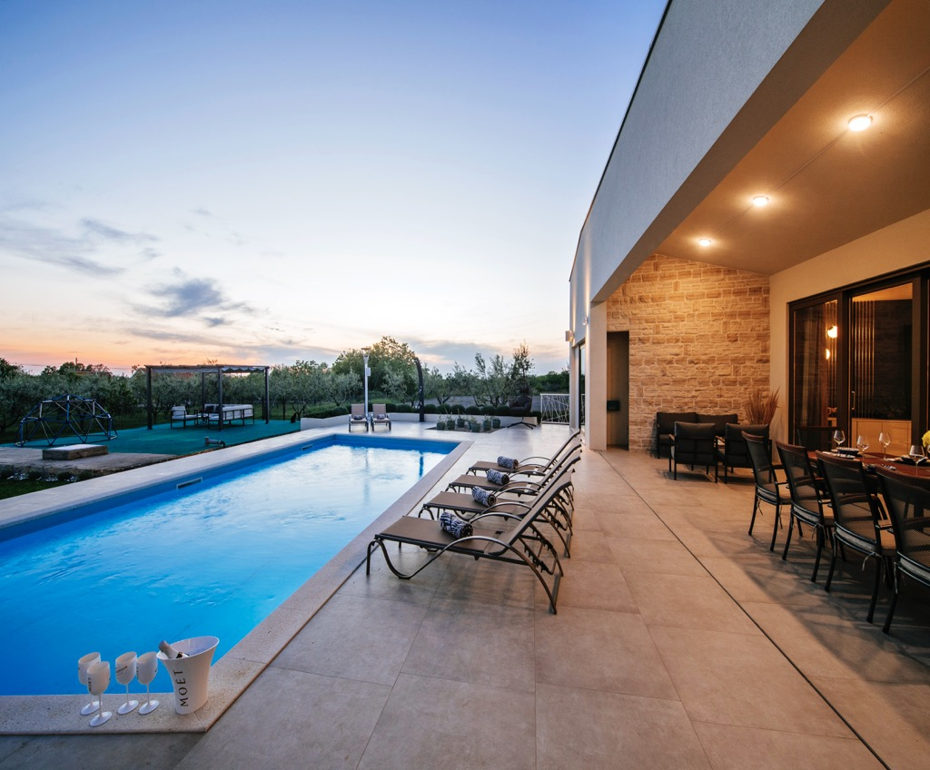 Egy szabálytalan alakú teraszon téglalap alakú úszómedencével rendelkezik.