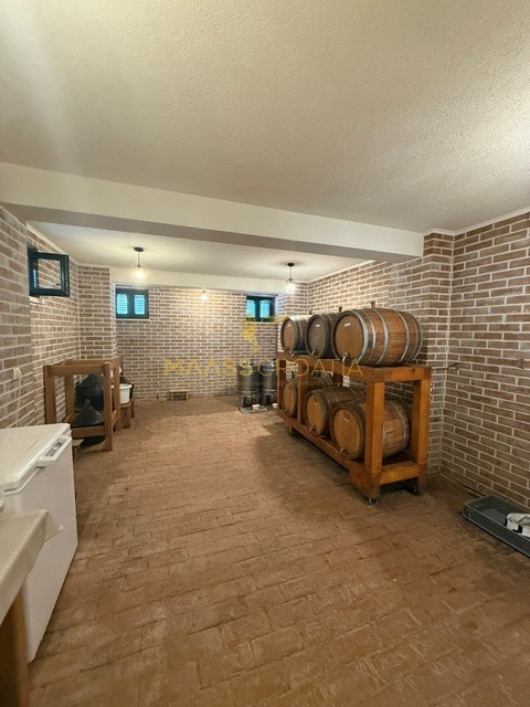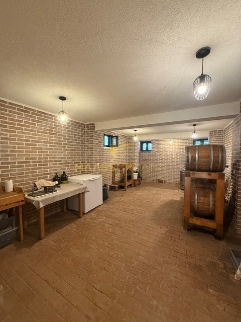 Az alagsorba külön külső lépcsőn keresztül lehet feljutni, ahol egy tágas kocsma található, saját konyhával, étkezővel és egy nagy, nyitott terű helyiséggel – ideális társas estékhez, kreatív hobbikhoz, fitneszhez vagy további vendégtérként.
