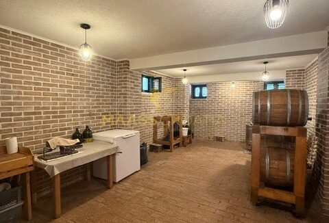 Az alagsorba külön külső lépcsőn keresztül lehet feljutni, ahol egy tágas kocsma található, saját konyhával, étkezővel és egy nagy, nyitott terű helyiséggel – ideális társas estékhez, kreatív hobbikhoz, fitneszhez vagy további vendégtérként.