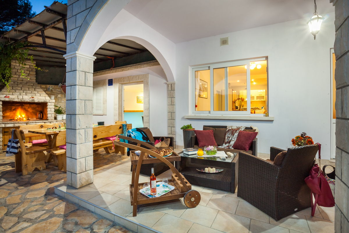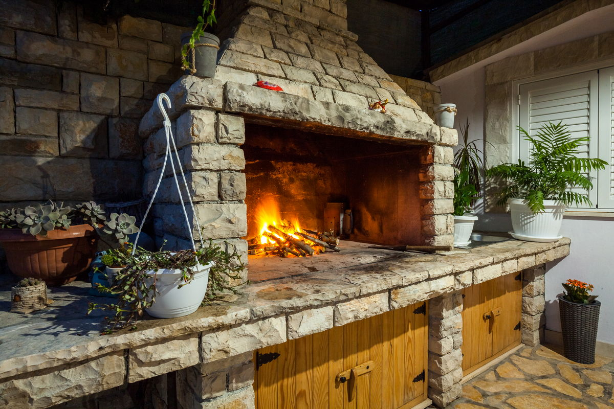 A földszinti teraszon, közvetlenül a medence mellett egy kőből készült grillező található a társas összejövetelekhez.