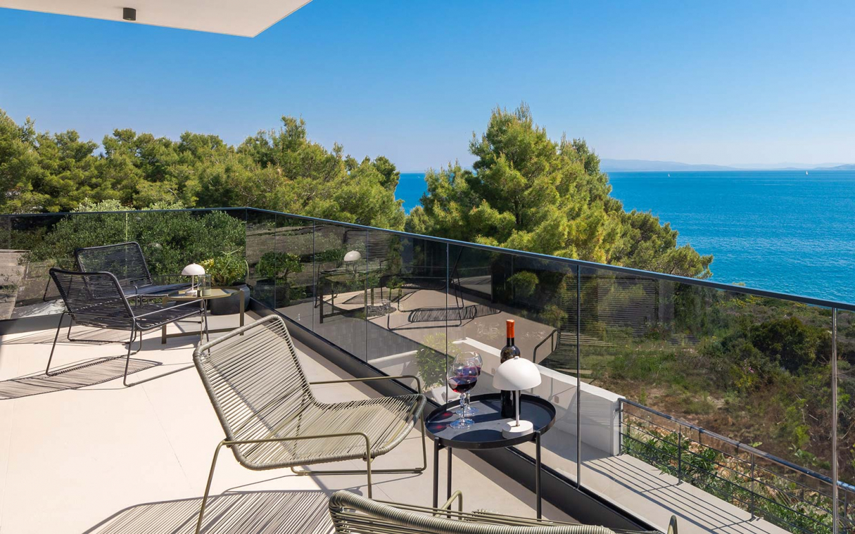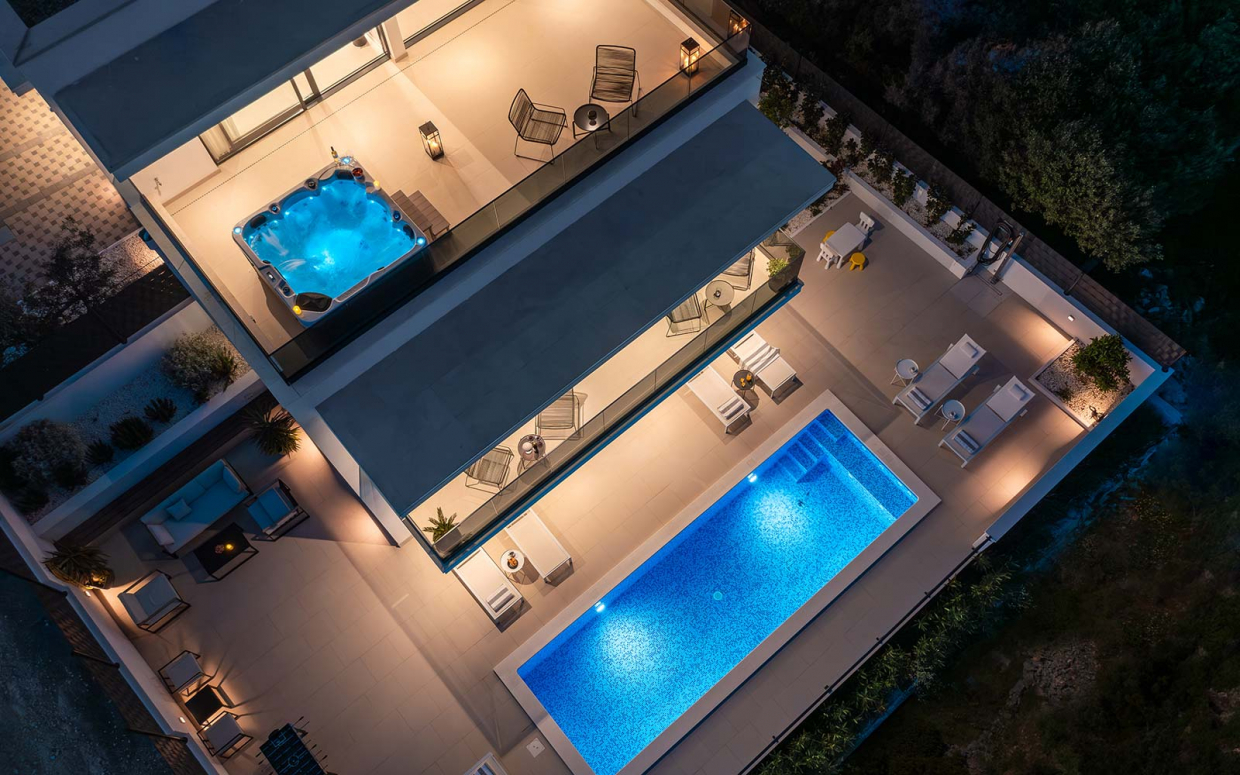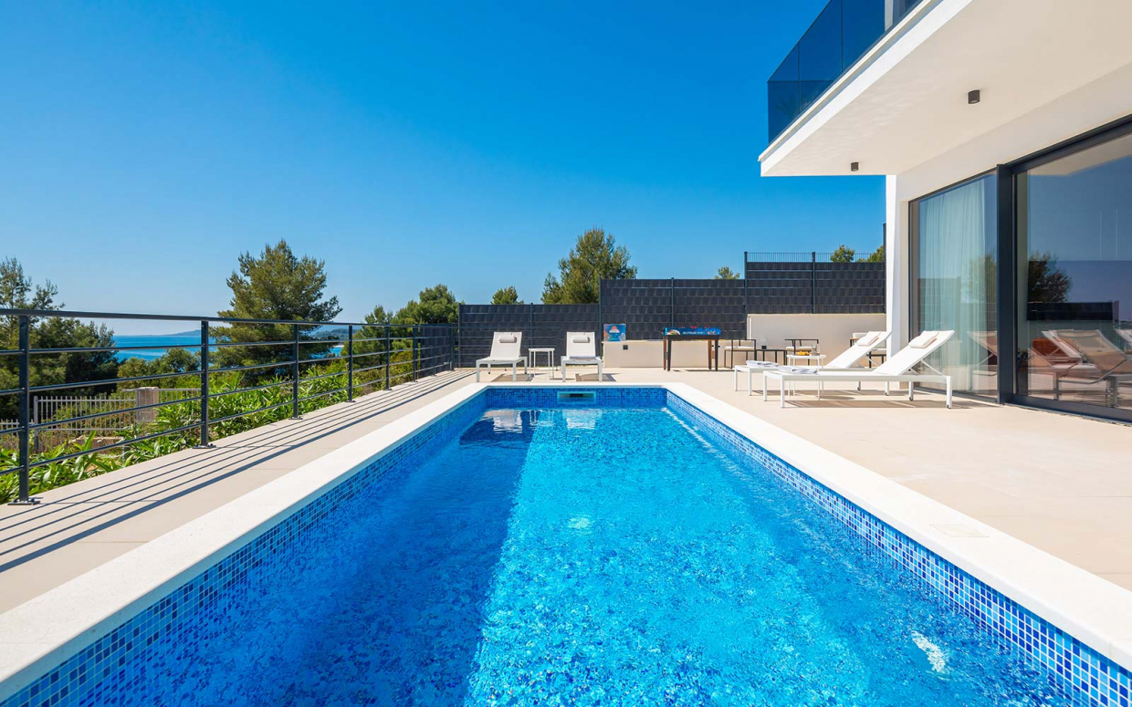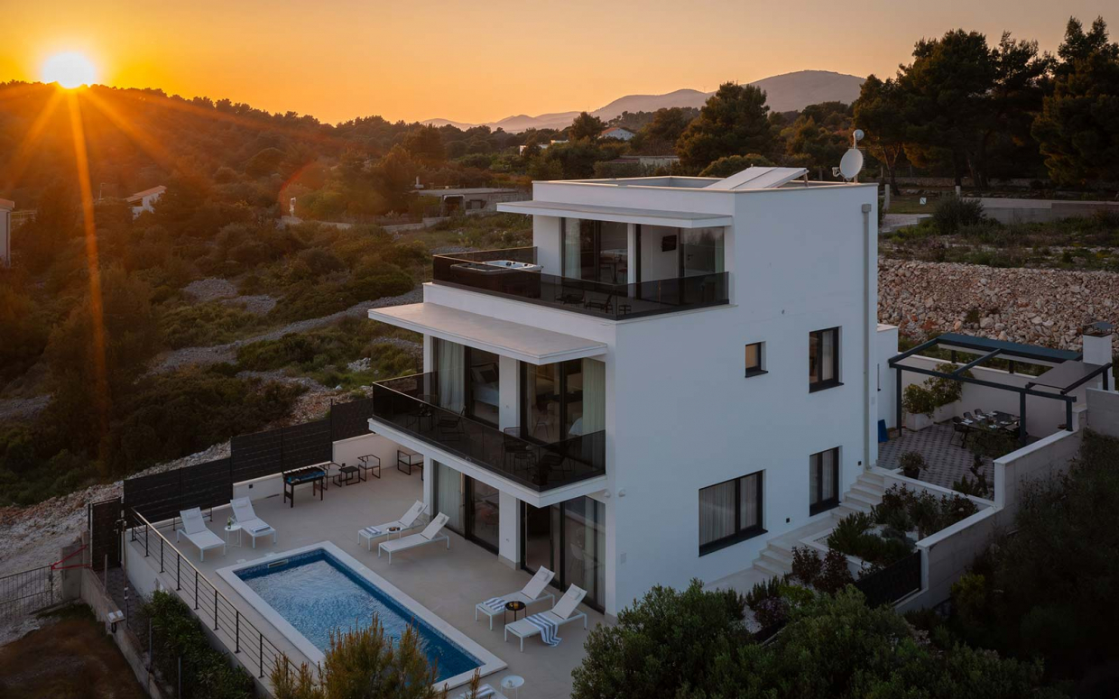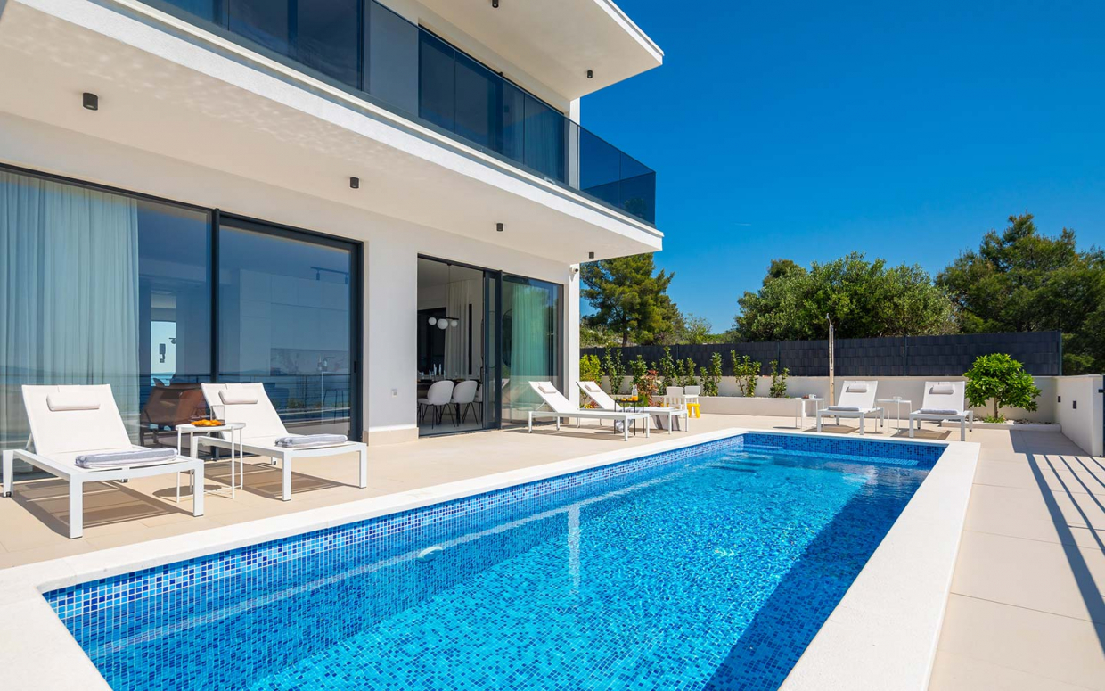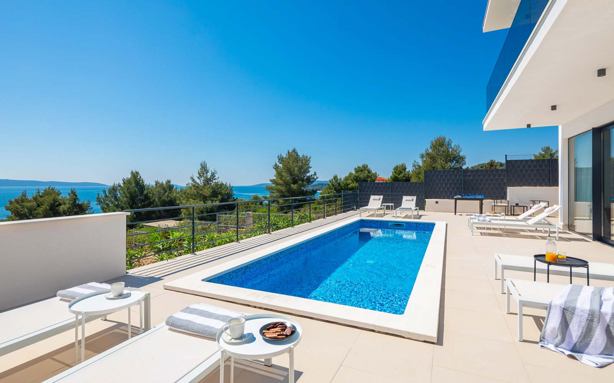 Atemberaubender Meerblick von Haus und Pool: Wunderschöne Steinvilla auf einem Hügel