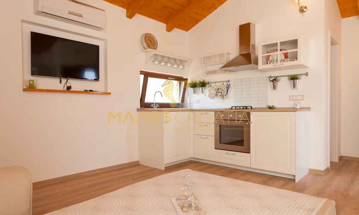 A belső tér modern és ízlésesen berendezett, kiváló minőségű bútorokkal, semleges árnyalatokkal, amelyek eleganciát és melegséget közvetítenek. A fűtésről fatüzelésű kandalló gondoskodik, meleglevegő-elosztással, míg a további kényelmet légkondicionáló biztosítja. A központi fűtéshez szükséges berendezések már el vannak készítve – már csak a radiátorokat kell felszerelni.