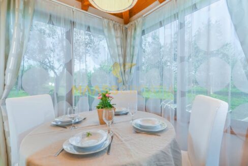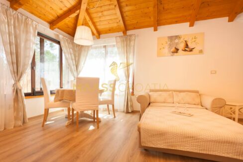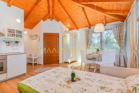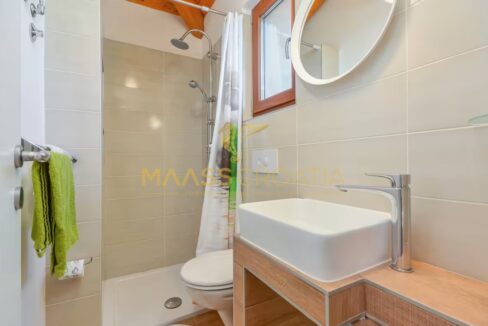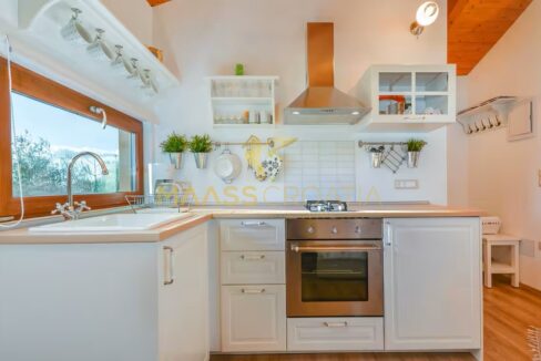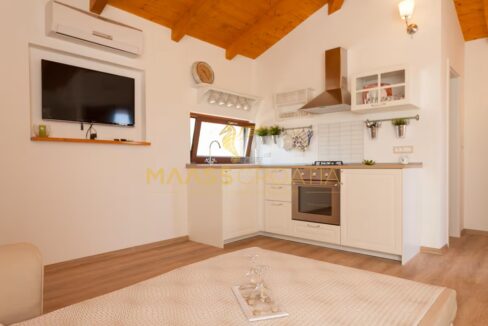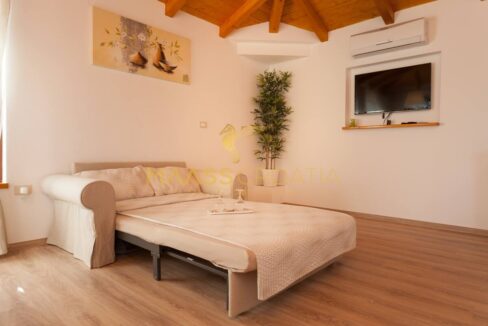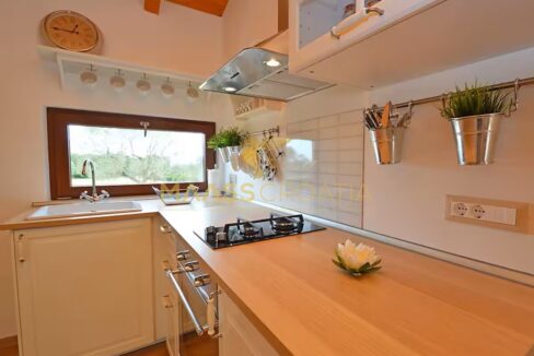A belső tér modern és ízlésesen berendezett, kiváló minőségű bútorokkal, semleges árnyalatokkal, amelyek eleganciát és melegséget közvetítenek. A fűtésről fatüzelésű kandalló gondoskodik, meleglevegő-elosztással, míg a további kényelmet légkondicionáló biztosítja. A központi fűtéshez szükséges berendezések már el vannak készítve – már csak a radiátorokat kell felszerelni.