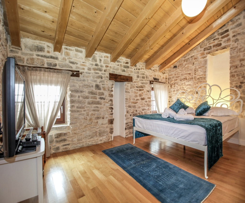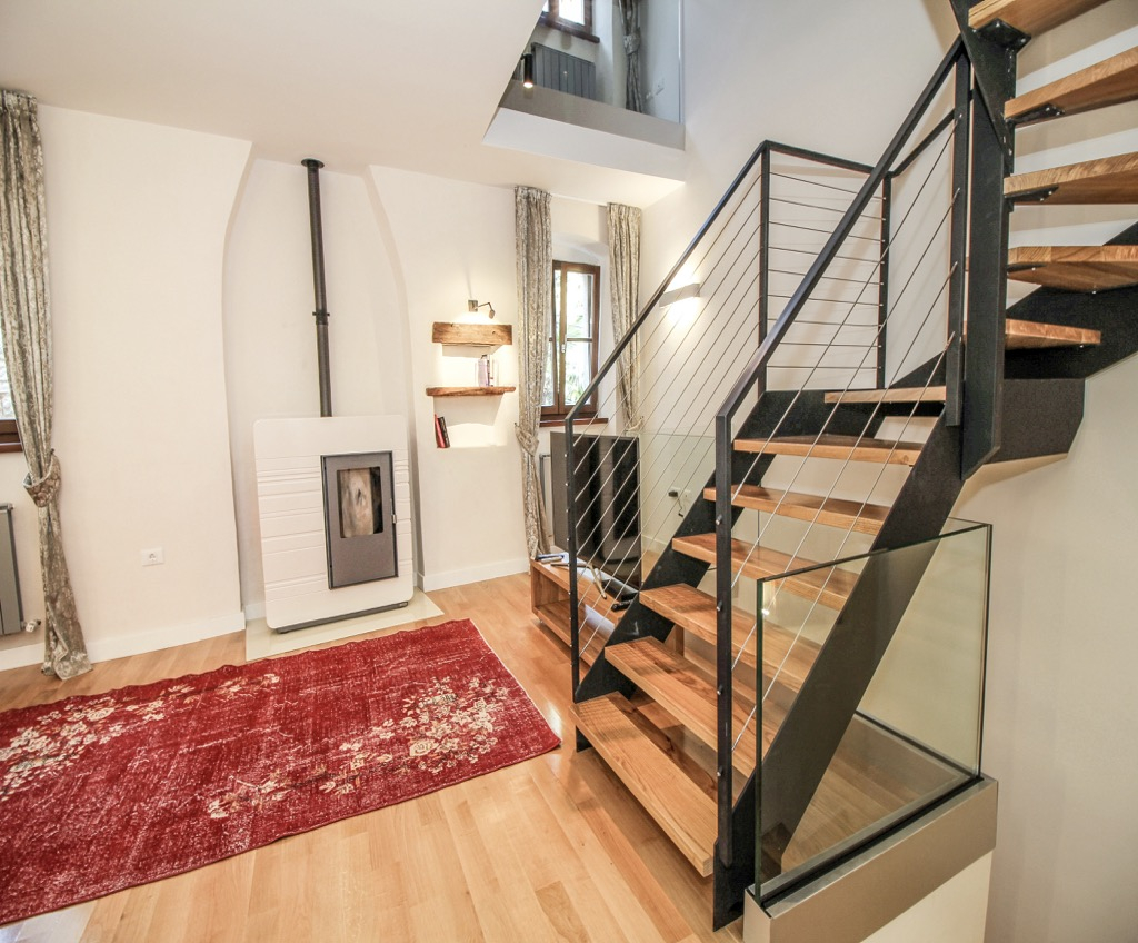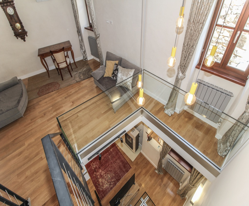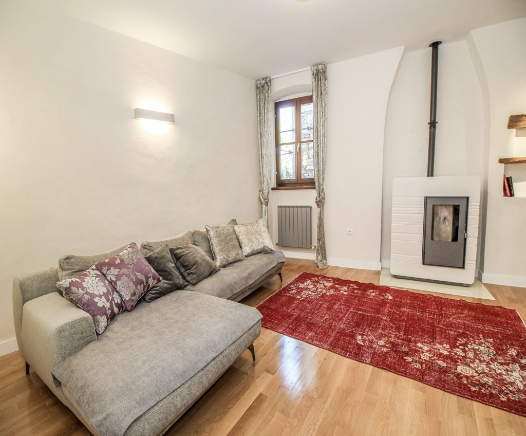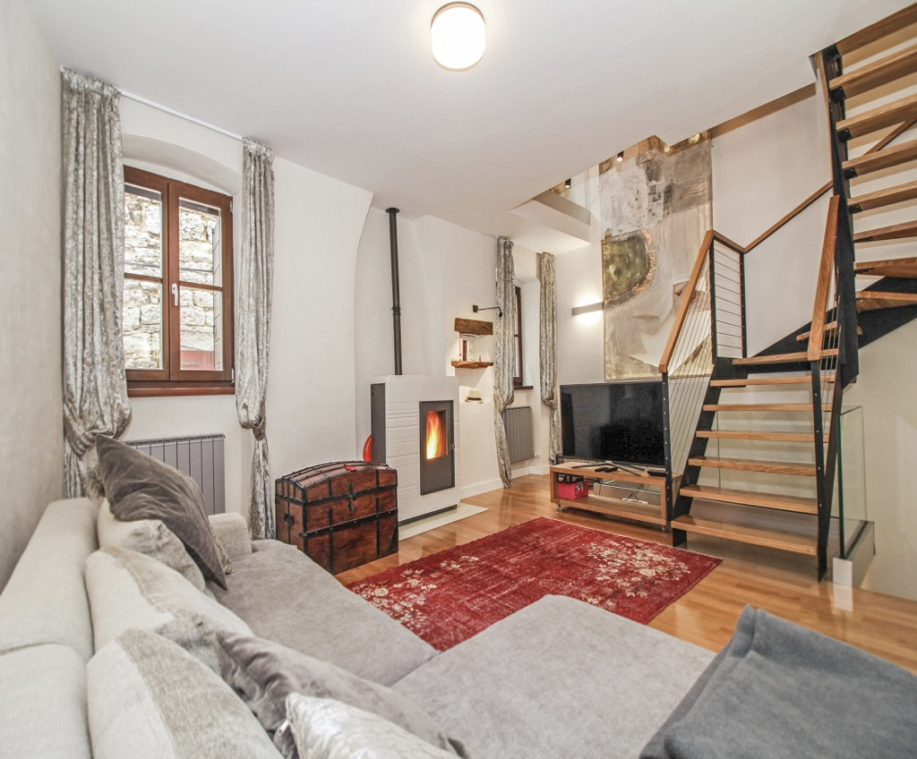 Az olyan részletek, mint a kőfalak, a fapadló és a fagerendák a tetőterületen, a régió jellegét adják ennek az otthonnak.