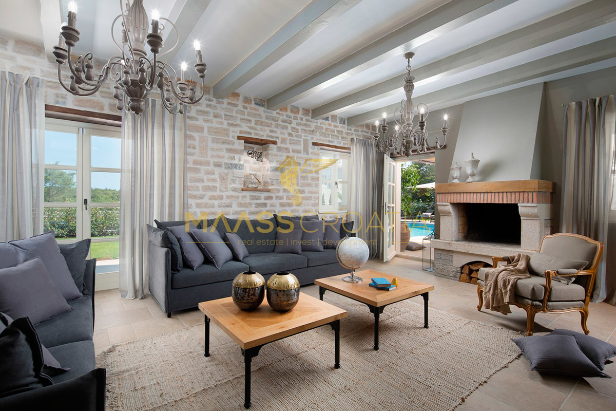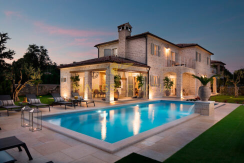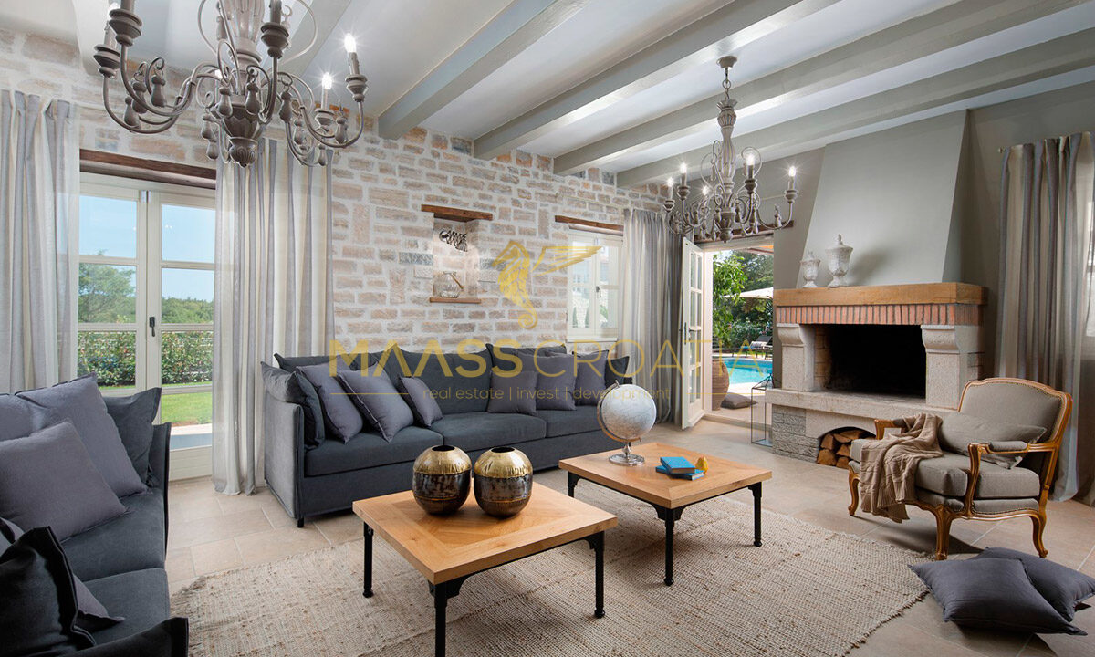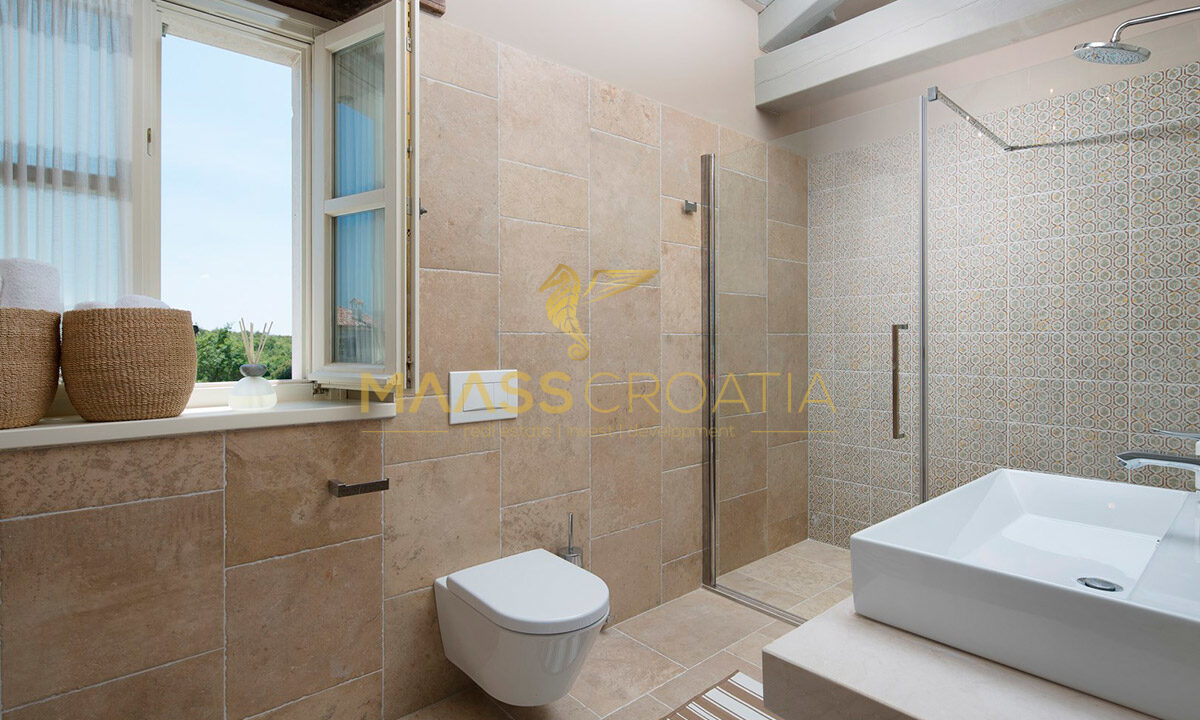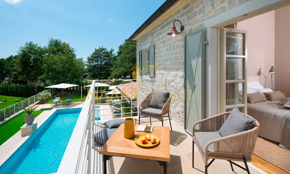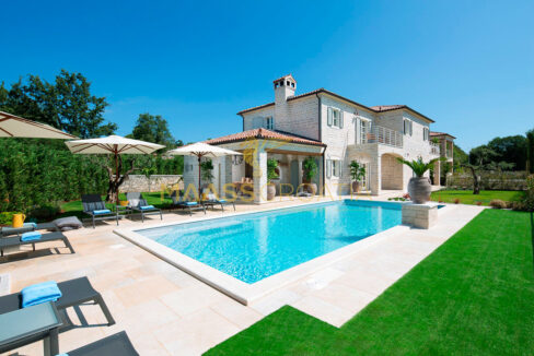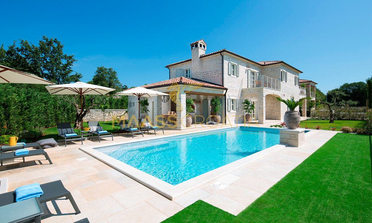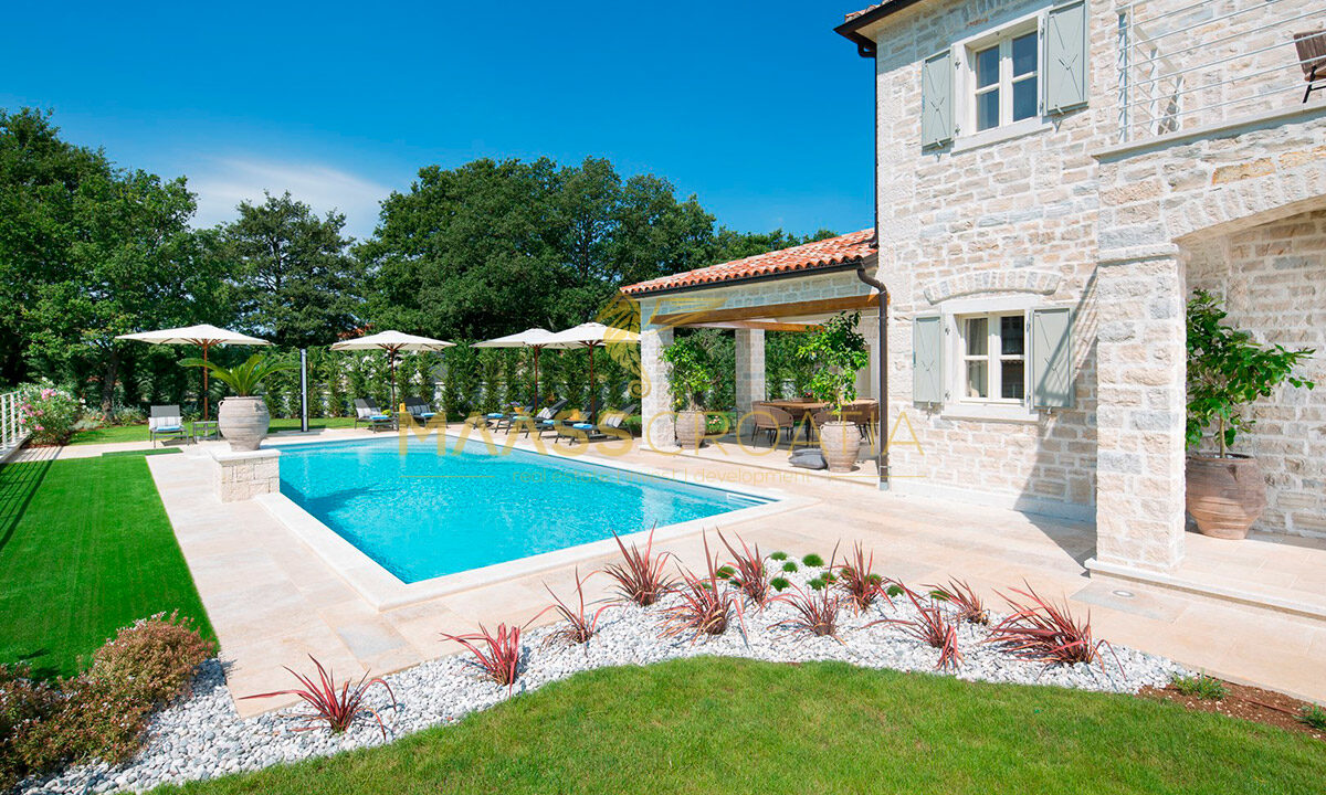 Eladó egy luxusvilla medencével, 359 m2-es lakóterülettel, 880 m-es kerttel, kb. 15 km-re Porečtől és kb. 16 km-re a tengertől, két teljesen légkondicionált emelettel.