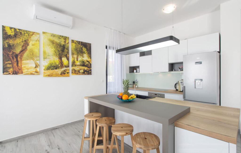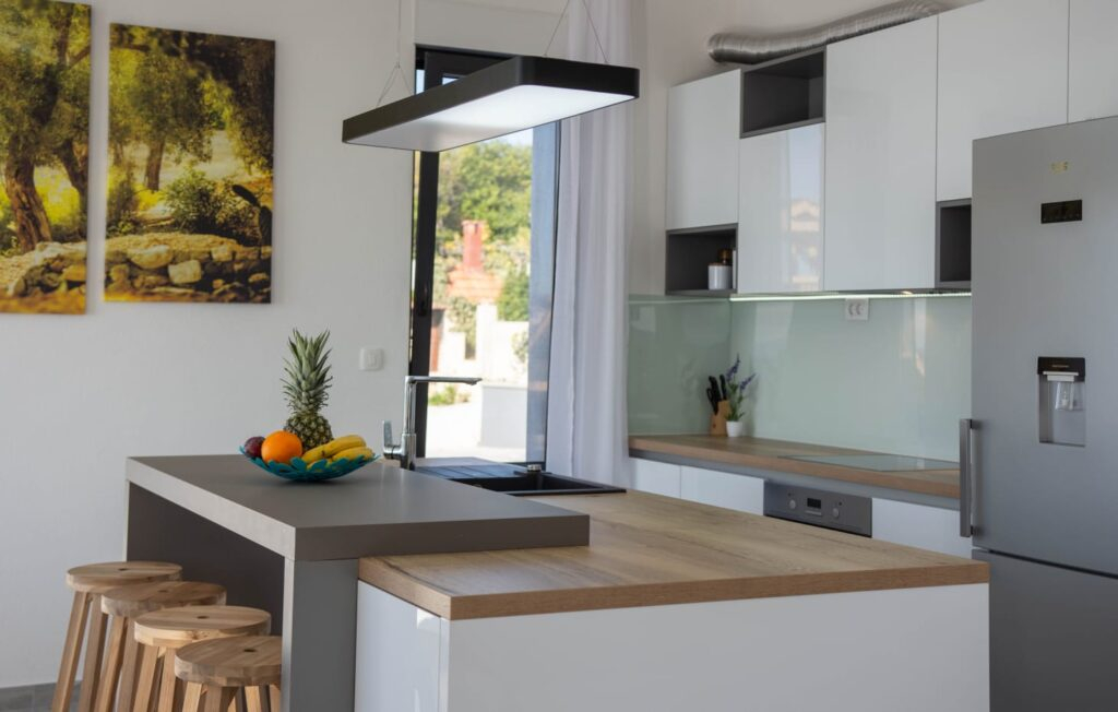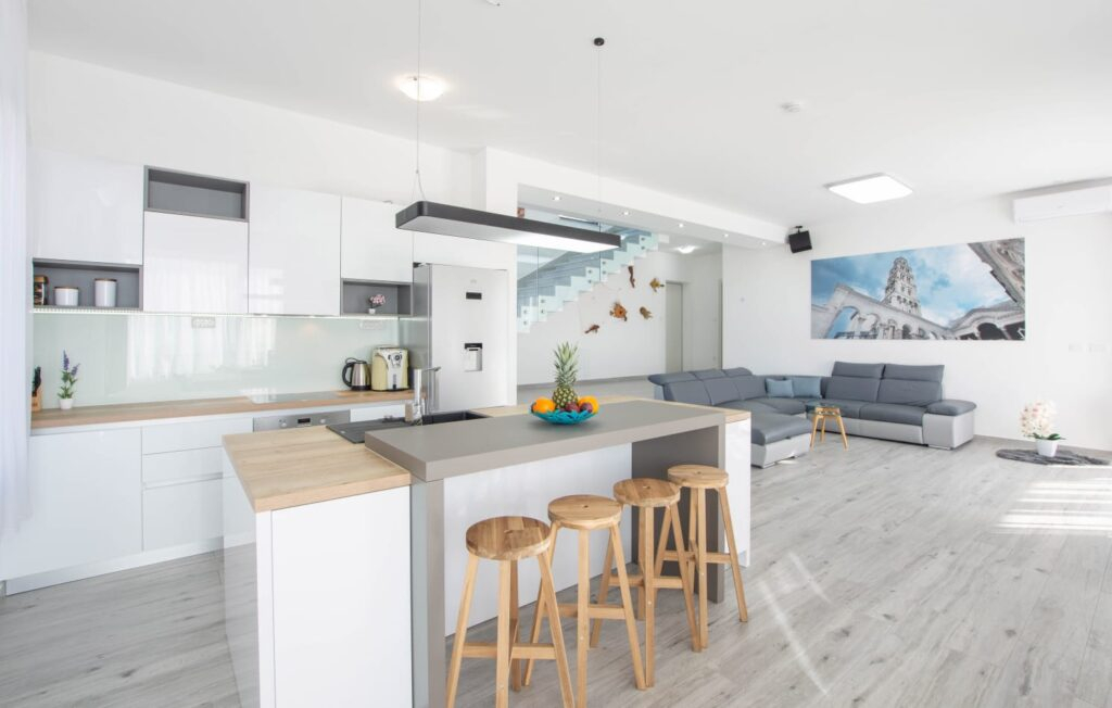 A fehér falak, a kőből készült részletek és a kiváló minőségű konyhai készülékek az egész hangulatot egy másik szintre emelik, de ugyanakkor az otthonos otthon érzését adják.