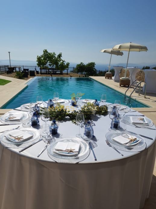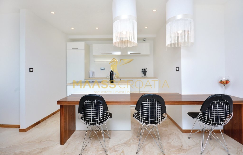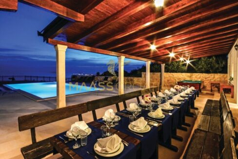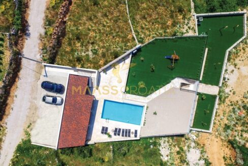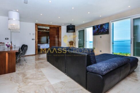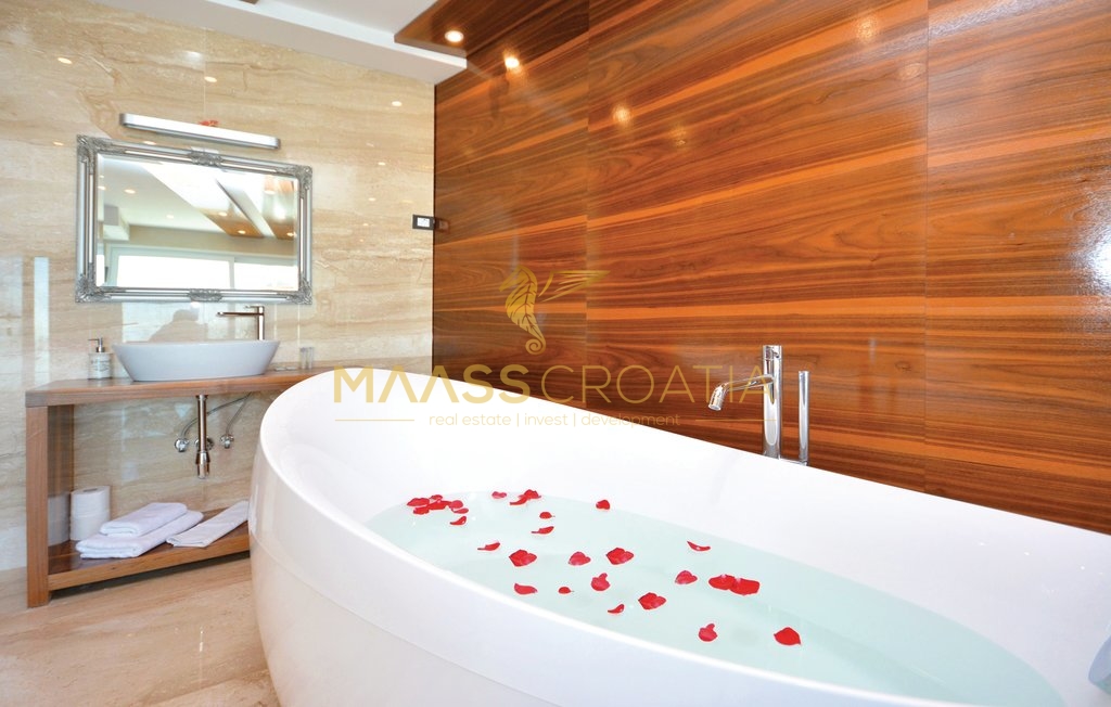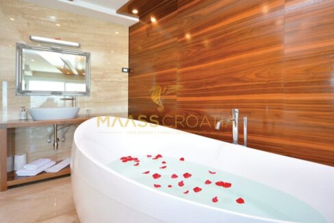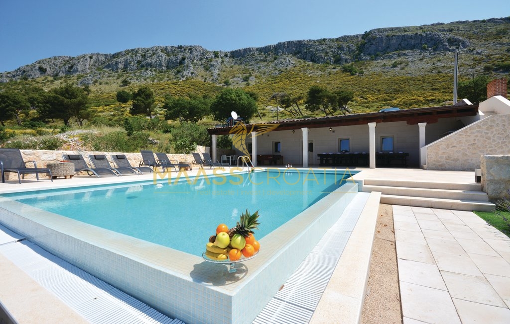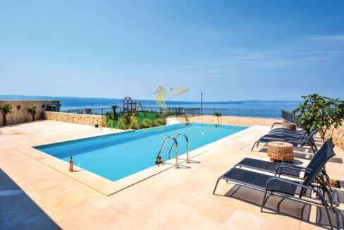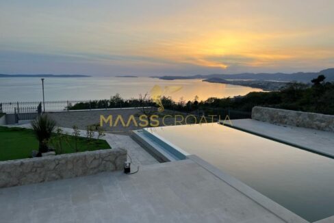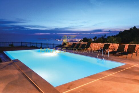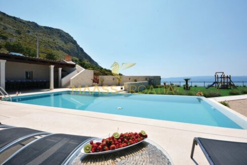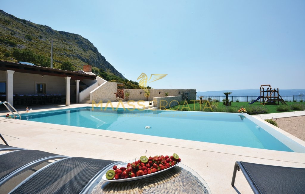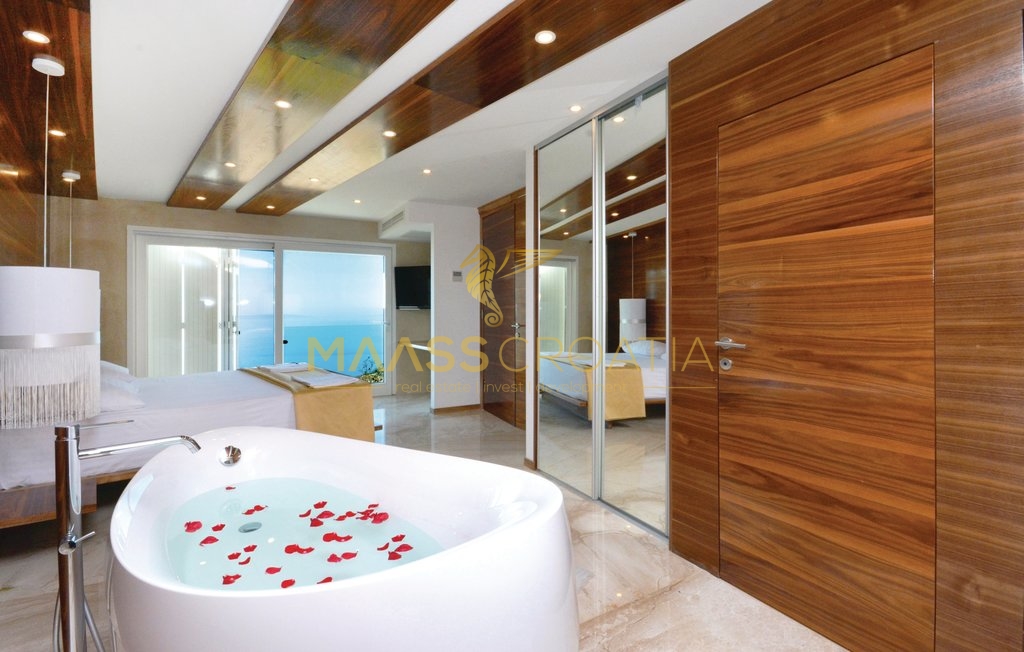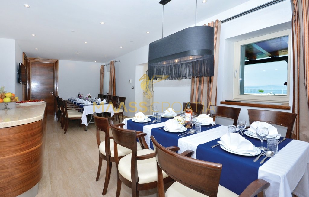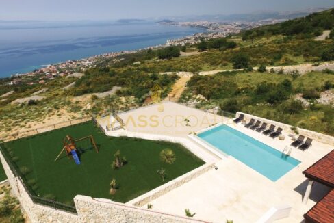 Ez a különleges és gyönyörű, luxus villa medencével Podstranában, kiváló elhelyezkedésének köszönhetően gyönyörű kilátással rendelkezik a tengerre, a szigetekre és Split városára.