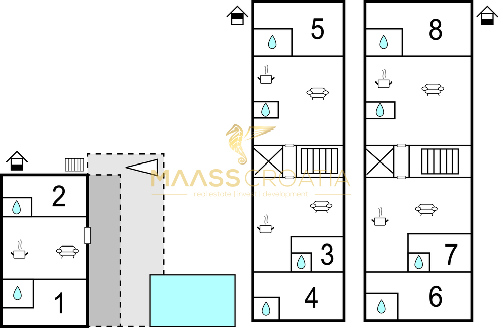 A ház öt teljesen berendezett, minden extrával felszerelt lakóegységből áll.
