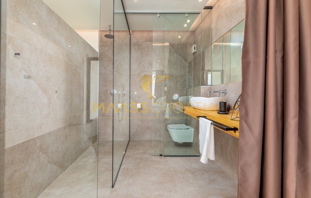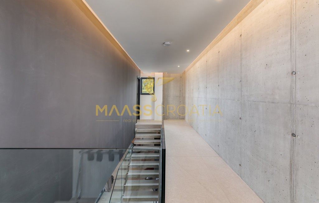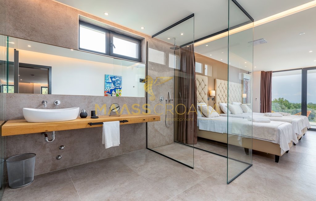 4 hálószoba saját fürdőszobával és egy nagy nappali konyhával és étkezővel. Ez a vadonatúj nyaraló igazi építészeti látványosság és Isztria egyik legszebb háza.