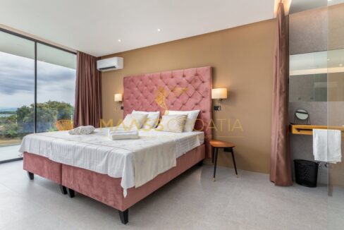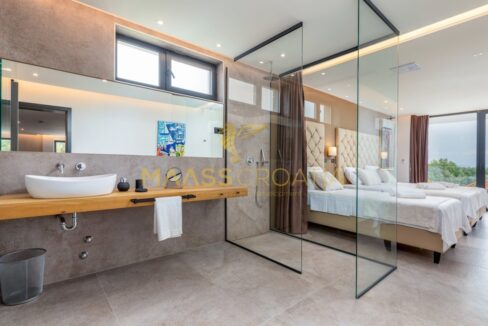 4 hálószoba saját fürdőszobával és egy nagy nappali konyhával és étkezővel. Ez a vadonatúj nyaraló igazi építészeti látványosság és Isztria egyik legszebb háza.