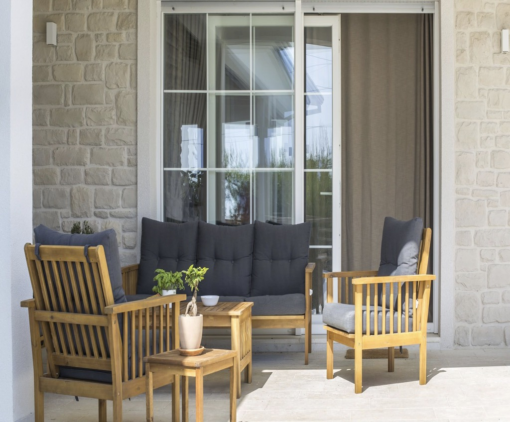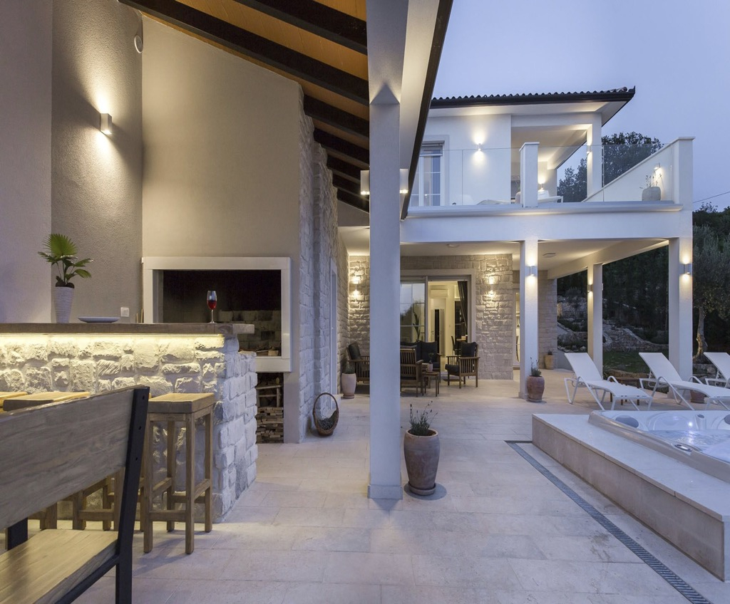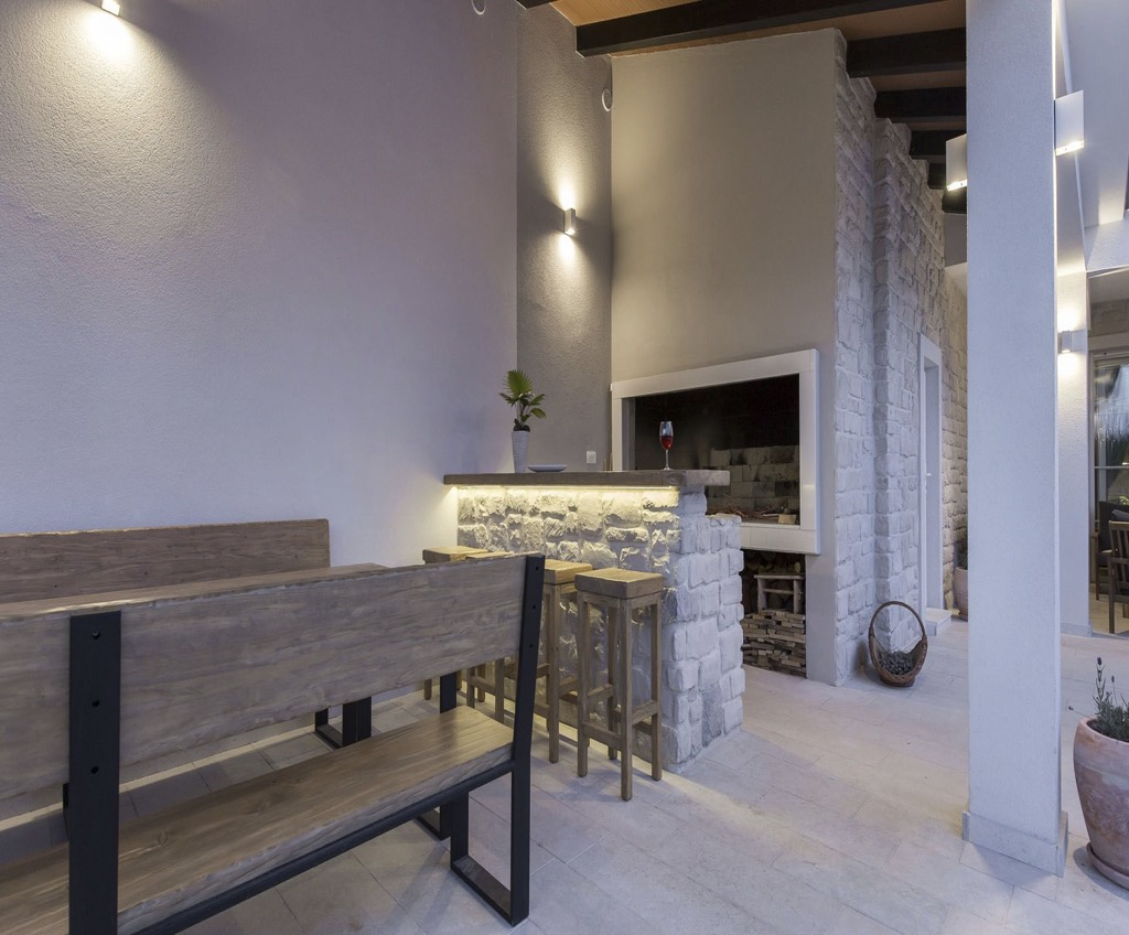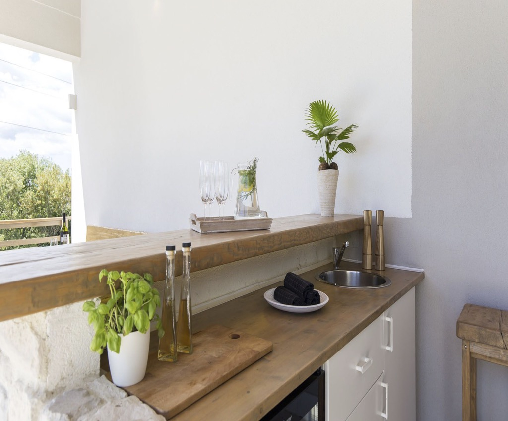 Kezdve a földszinten, ahol van egy tágas terasz, amelyhez egy szabadtéri konyha kapcsolódik, saját bárral és padokkal.