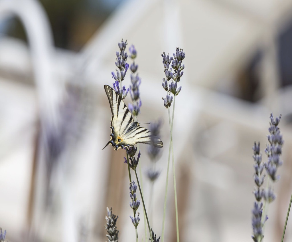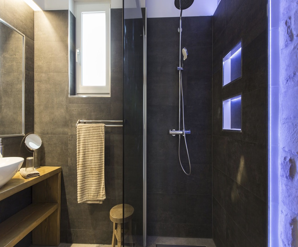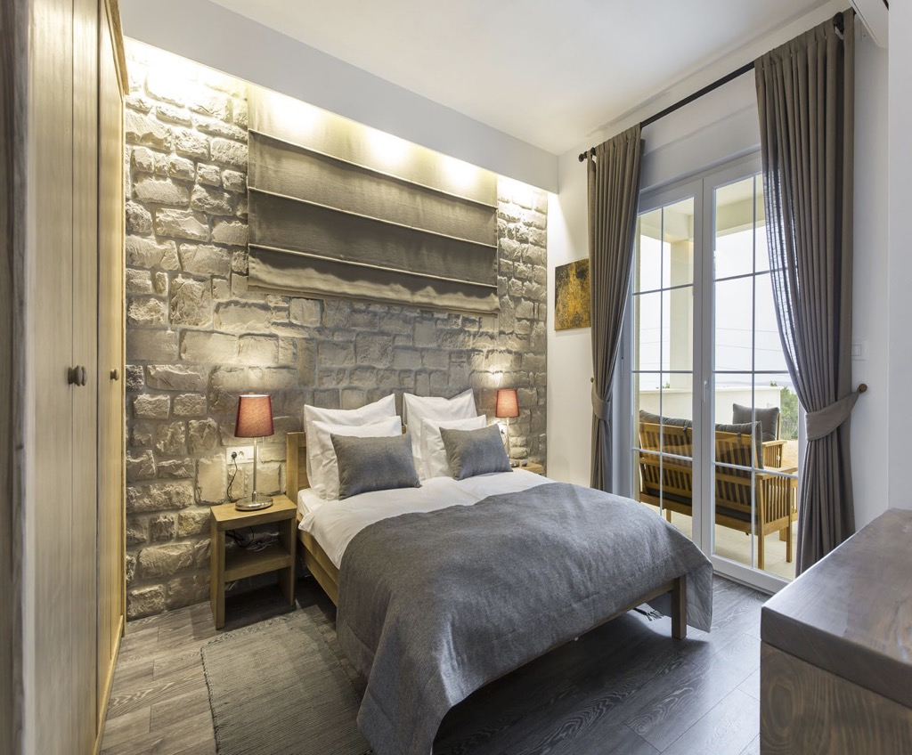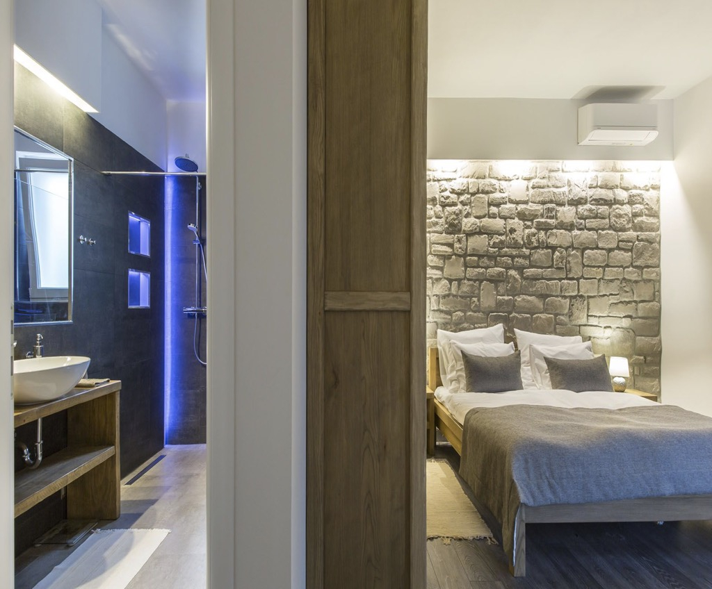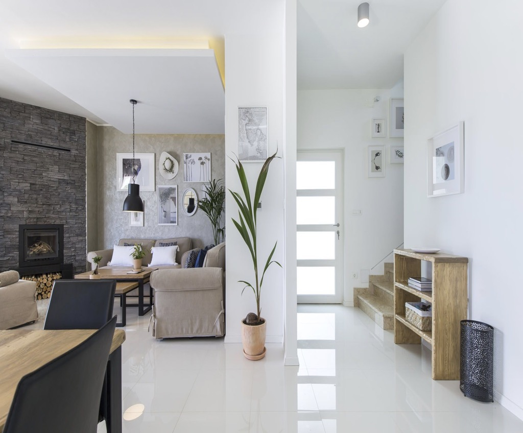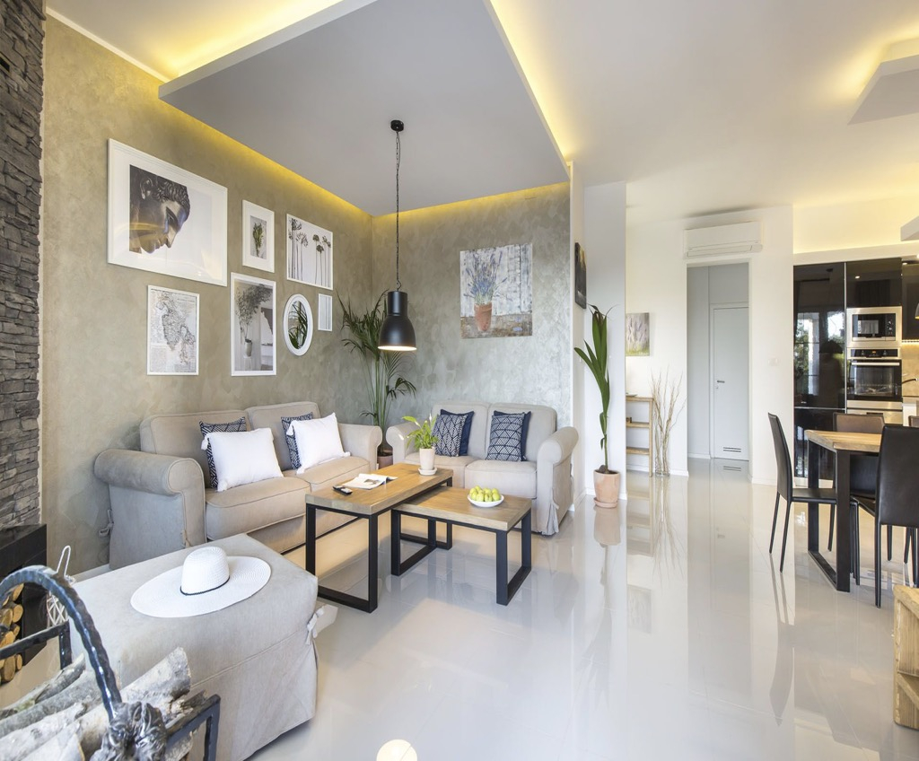 A belső kialakítás egyszerű és minimalista, de természetes anyagokkal, például kővel és keményfával díszített, ami a háznak megfelelő mediterrán jelleget kölcsönöz.