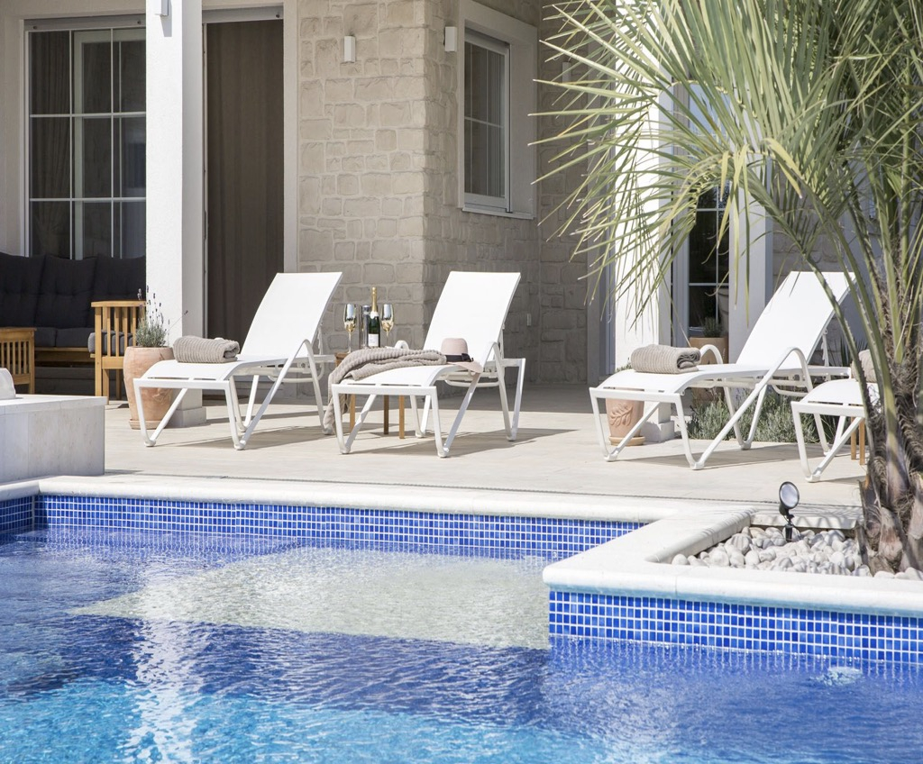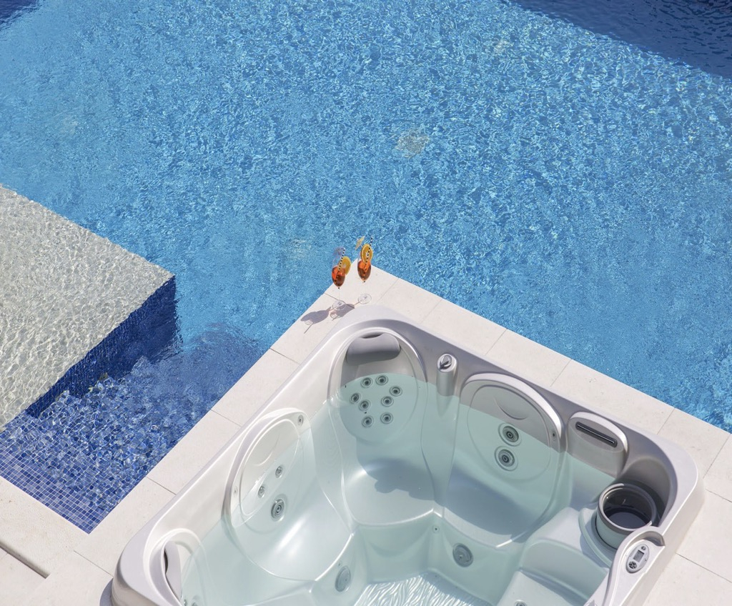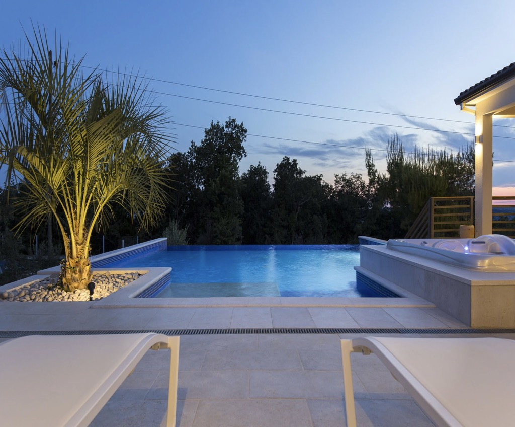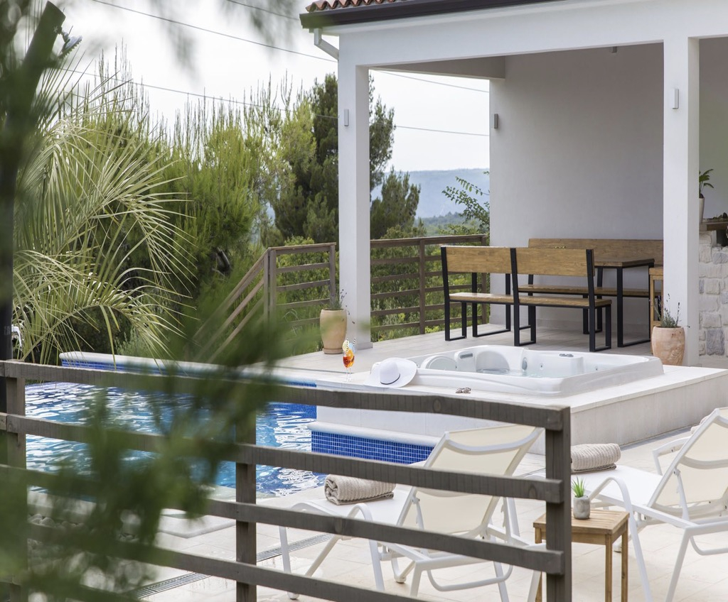 Van egy úszómedence beépített jakuzzival, amely közvetlenül kapcsolódik a teraszhoz és a társalgóhoz.