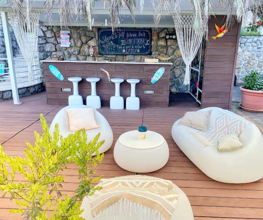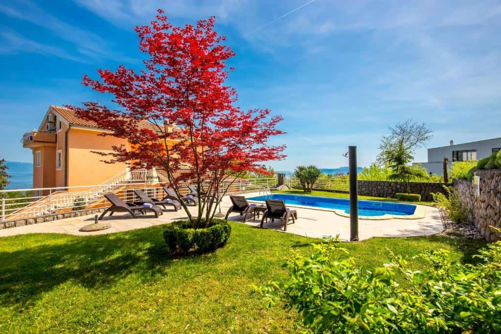 Bőséges parkoló, gondozott udvar medencével és tengerre néző szobákkal.