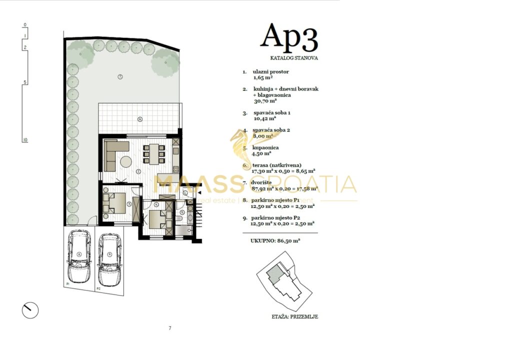 Az AP3-as lakás egy összesen 7 lakással rendelkező lakóépület földszintjén található. Lakóterülete 63,92 m², egy fürdőszobából, két hálószobából, egy tágas konyhából, étkezővel és nappaliból áll, amely egy nagy, 17,30 m²-es fedett teraszra nyílik.