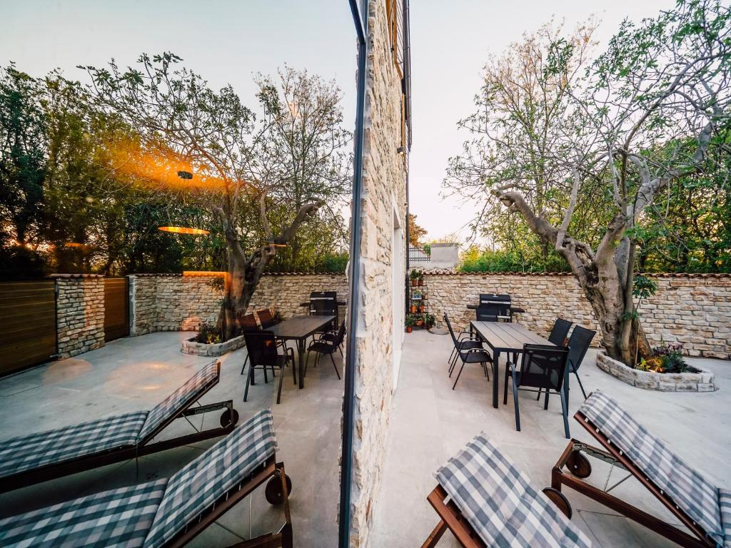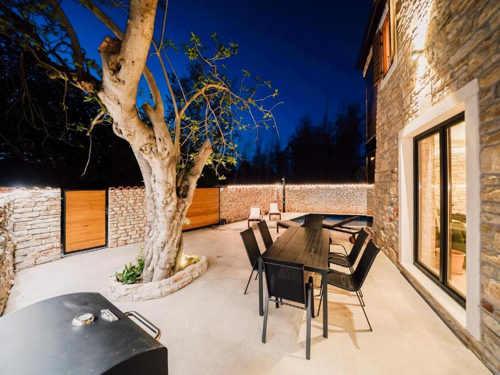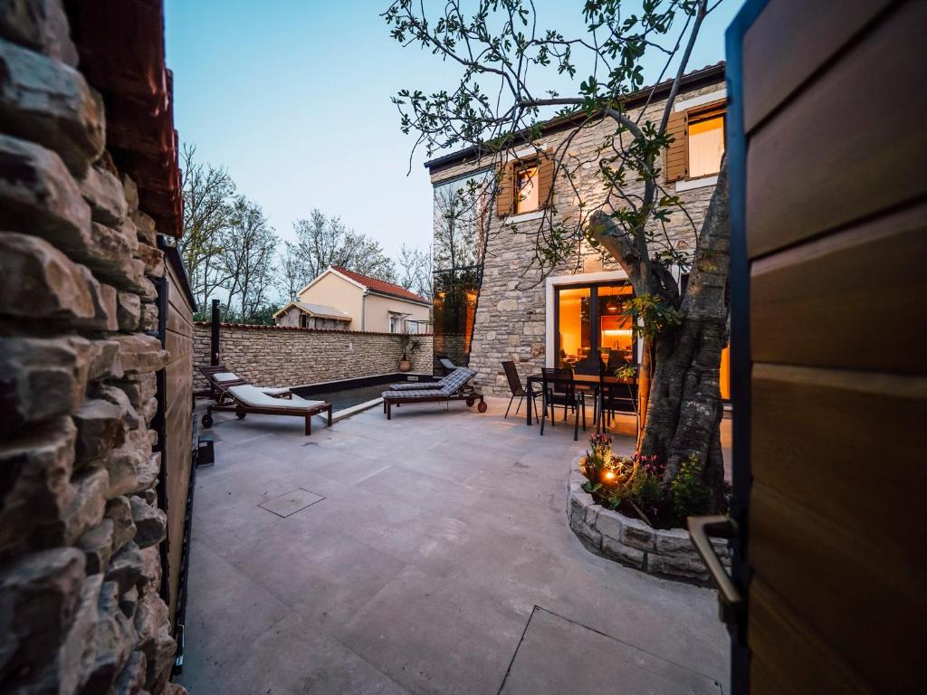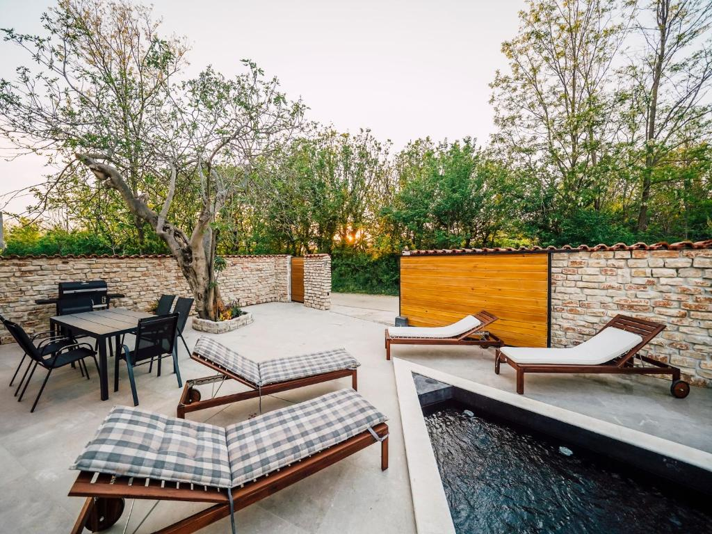 Az alacsony fenntartású udvar teljesen zárt és teljes magánéletet biztosít. Az alaprajzba ügyesen beágyazott medence, napozóterület és ülőhely található.