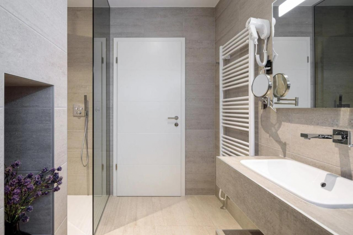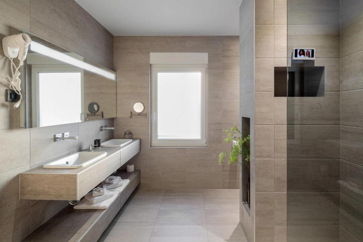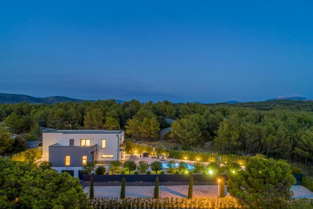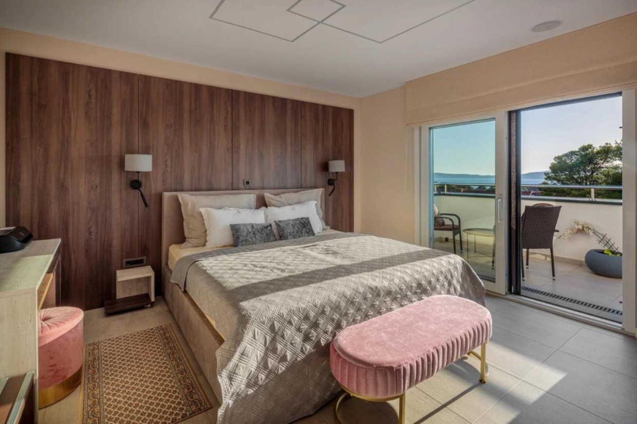 Fehér kőből készült ékszer medencével és panorámás kilátással a tengerre Novaljában